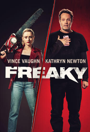 Vince Vaughn (mostly known for comedy movies, such as Dodgeball and The Internship, but before Freaky, also Norman Bates in the 1998 Psycho remake) is the Blissfield Butcher, an urban legend of a serial killer in the small town of Blissfield. After finding a mystical dagger in the tense opening, he attempts to kill Millie Kessler (Kathryn Newton, Little Big Lies). In doing so they end up switching bodies and Millie, in the Butcher’s body, has until midnight to reverse it or she is stuck like that forever.